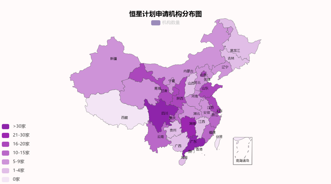 2020年申请“恒星计划”的353家机构来自30个不同的省、直辖市、自治区。其中,报名最踊跃的5个地区分别为四川(40)、广东(36)、湖南(24)、上海(22)和北京(20)。