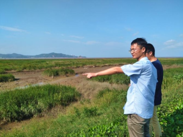 吴昊亮与福建观鸟会伙伴在闽江口湿地。下方是一望无际的入侵物种互花米草,远处的湿地是极危物种中华风头燕鸥和黑脸琵鹭的栖息地。
