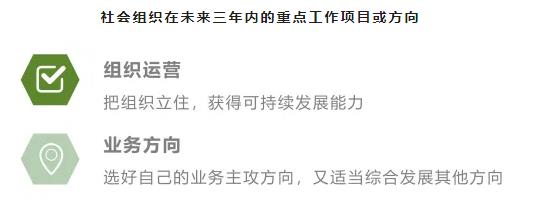 问卷调查显示,对于组织目前的发展,大多组织最急需的是资金支持、专业稳定的团队、政府支持;其次是核心有效的业务模式、专业技能和组织发展赋能、科研合作。